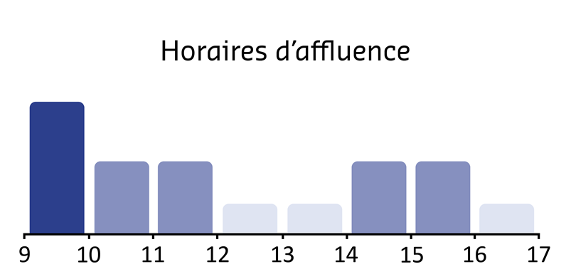 Afin de vous aider, vous trouverez ci-dessous un schéma indiquant les heures d’affluence : il vous permettra de choisir le bon créneau et d’éviter une trop longue attente.